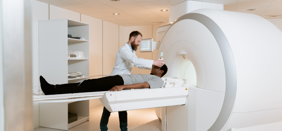 - El paciente se tumba en una camilla que se desliza dentro del escáner de resonancia magnética. Este contiene un imán fuerte que crea un campo magnético uniforme alrededor del cuerpo.